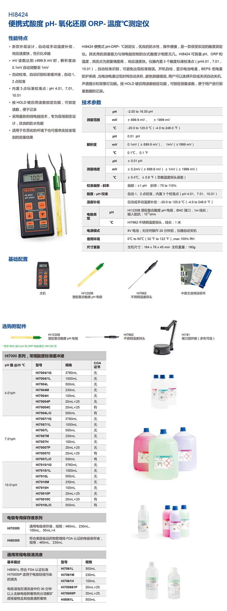 產品描述:pH范圍:-2.00 to 16.00pH;mV范圍:±699.9 mV、±1999 mV LCD屏幕顯示,可使您輕松查看pH、mV、溫度測量讀數;自動識別校準,自動關閉,屏幕指示和自動手動溫度補償,電池更換簡單快速,BEPS低電量防錯系統,避免錯誤測量,防水緊湊設計,防止任何水滲入儀器損壞儀器........