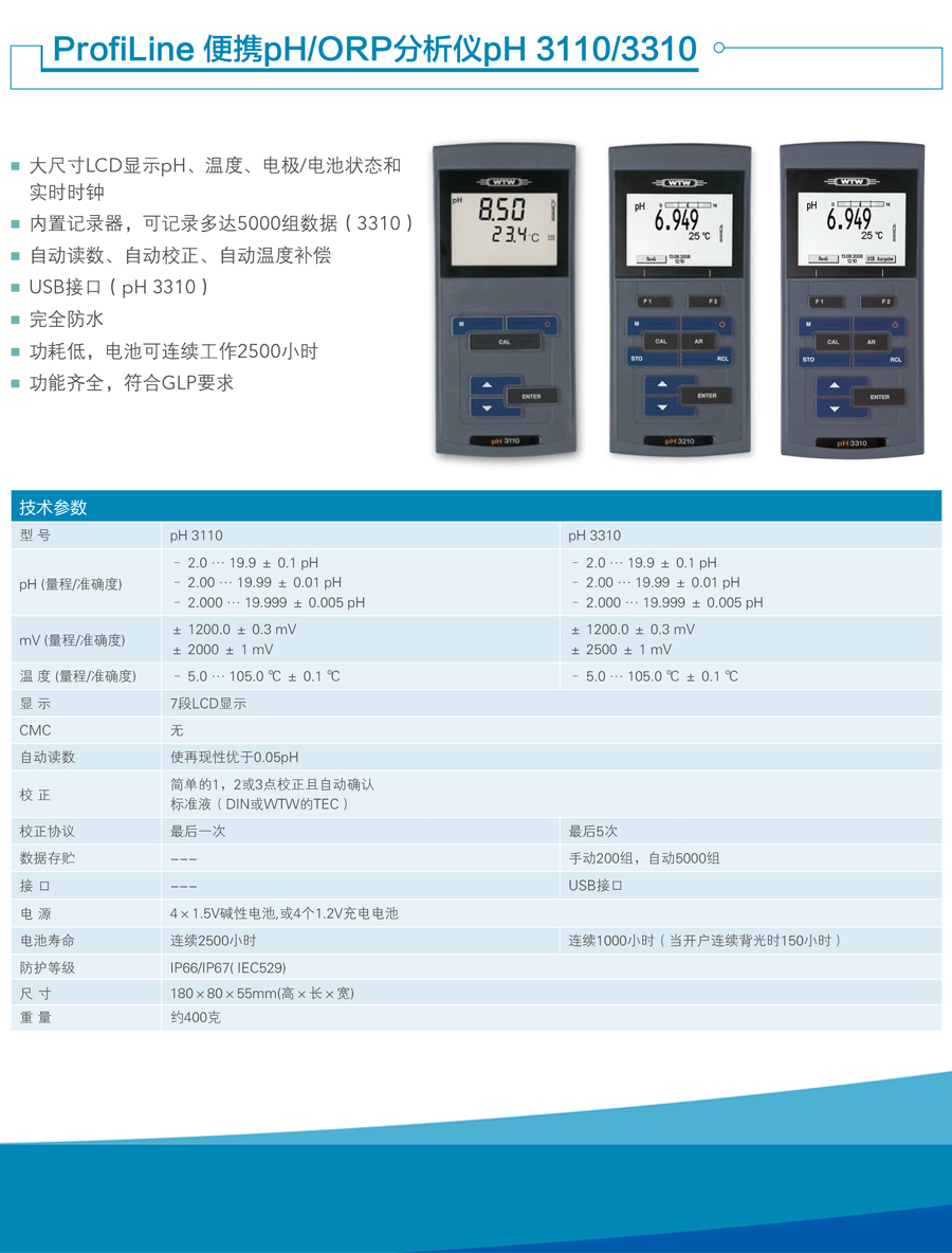 德國WTW ProfiLine PH3110/3210/3310手持式pH/mV測試儀可測量pH、mV和溫度,很高分辨率0.001pH;可連接各種標準PH復合電極或ORP電極。