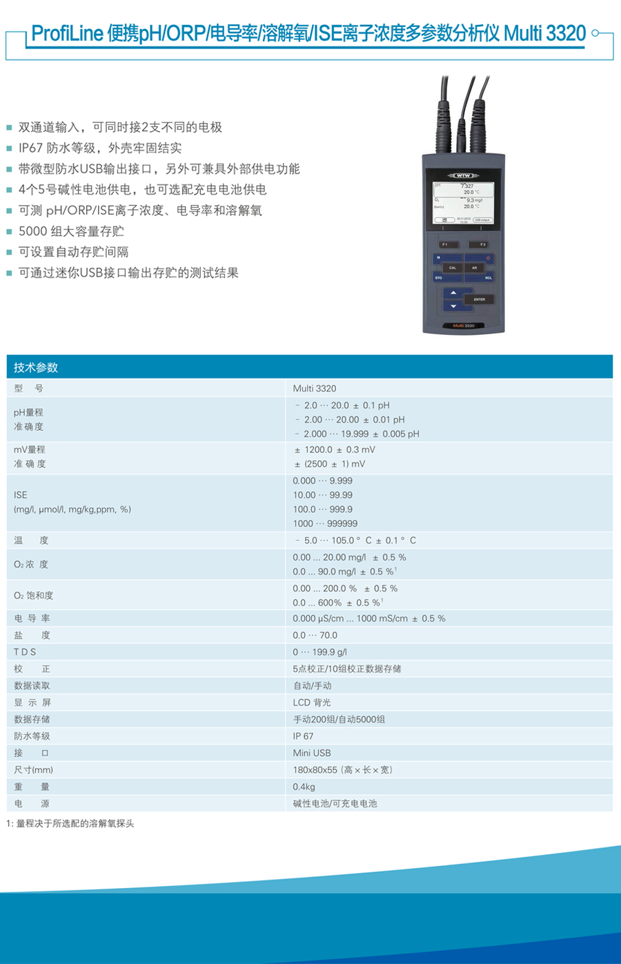 Multi 3320手持式多參數測試儀,測量PH、ORP、ISE、電導率、溶解氧及溫度,可連接各種模擬的標準PH復合電極或ORP電極、電導率電極、離子電極和溶解氧電極,LCD背光顯示,可同時檢測PH值、ORP值、電導率值、溶解氧值、溫度值等多種參數。