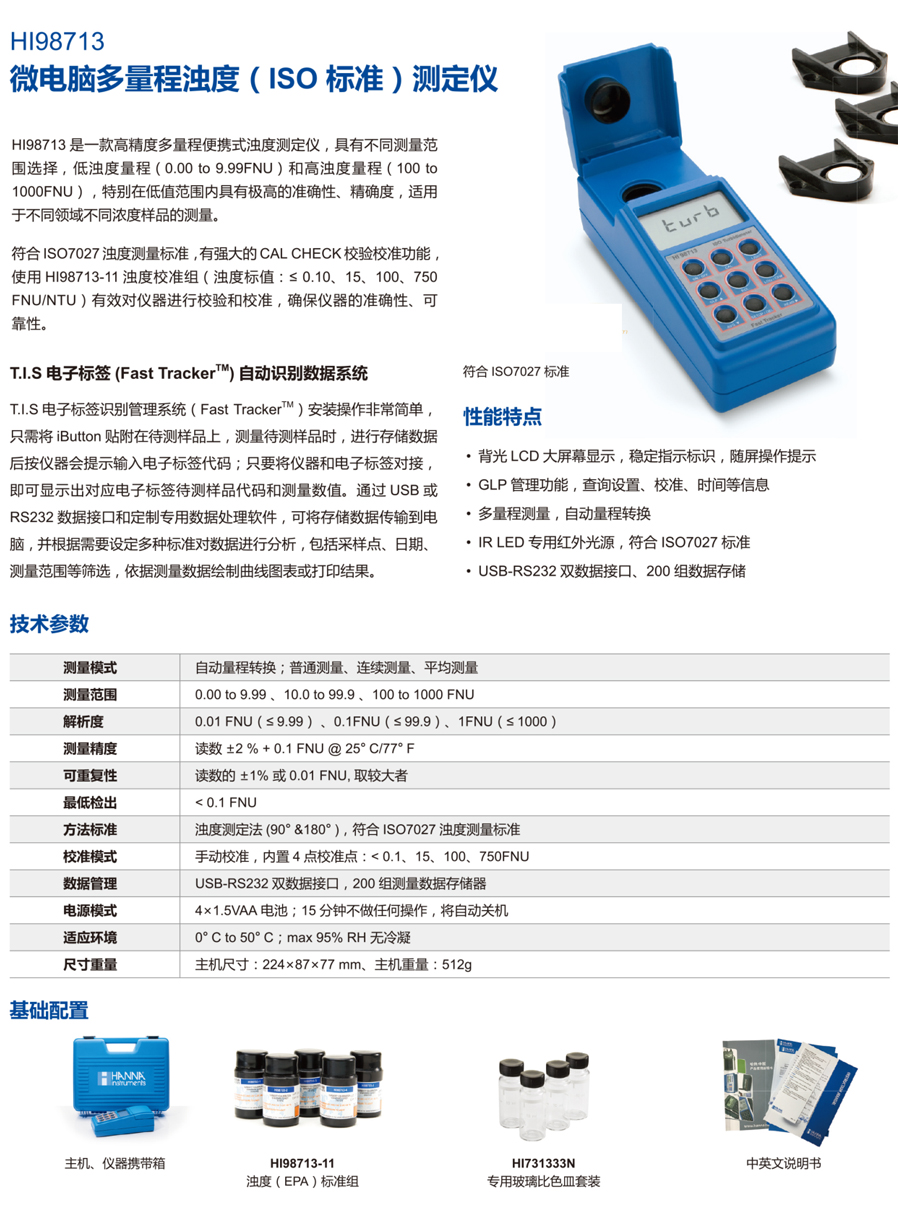 主機,HI98713-11 定制專用濁度(ISO)標準組(標值@25°C:≤ 0.1、15、100、750 FNU),HI731333N 專用玻璃比色皿套裝,HI93703-58 玻璃比色杯潤滑劑,HI920005 T.I.S電子標簽(5個),HI710006 AC230V/12VDC 電源適配器,中英文使用說明書,HI710134 定制專用儀器攜帶箱【溫馨提示:建議訂購HI93703-50比色皿清潔液和HI731318玻璃比色皿清潔布,用于玻璃比色皿清潔修復,確保測量精度和讀數(shù)準確度】