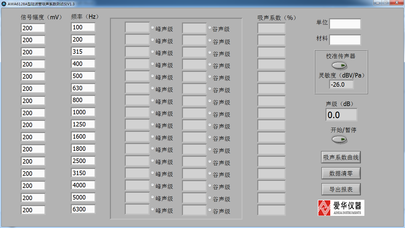 AWA6128A型駐波管吸聲系數測試儀用于測定垂直入射條件下吸聲材料的吸聲系數。測試儀由駐波管、傳聲器、測試主機、顯示器、鍵盤鼠標等組成。測試儀軟件根據測量到的峰聲級值和谷聲級值自動計算出吸聲系數,并能生成吸聲系數與頻率的坐標曲線。儀器輸出信號的頻率和幅度在規定范圍內可自由設定。由于只需少量的吸聲材料作試件,所以對于吸聲材料的參數研究和設計特別適合。
