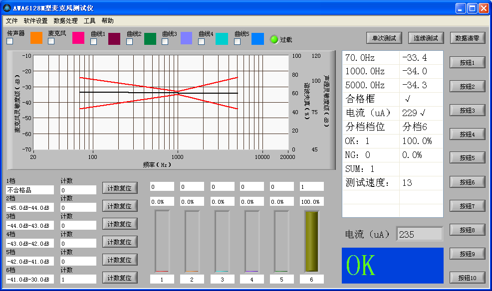 AWA6128M型駐極體傳聲器測試儀主要由測試主機(jī)、帶聲反饋測試傳聲器的測試聲源和控制盒等組成,主要配合分選臺(tái)對(duì)駐極體傳聲器(咪頭)進(jìn)行自動(dòng)分類。測試儀同時(shí)測量駐極體傳聲器的低頻靈敏度、1 kHz靈敏度、高頻靈敏度和工作電流等參數(shù)。高頻和低頻測試頻率可自行設(shè)定,也可選擇不測。根據(jù)駐極體傳聲器的中頻靈敏度、低頻上下限、高頻上下限、漏氣、電流等測量結(jié)果對(duì)駐極體傳聲器進(jìn)行分類,通過串口輸出分檔指令給分選臺(tái),并統(tǒng)計(jì)分類結(jié)果。簡潔直觀地顯示 PASS/NG測量結(jié)果,自動(dòng)判斷良品和不良品,極大的提高了測試效率。聲反饋測試傳聲器同時(shí)測量聲源的聲壓,反饋控制信號(hào)源的輸出,使聲源聲壓保持恒定,從而排除由于測試聲源聲信號(hào)的不穩(wěn)定而造成的測試結(jié)果前后變化。