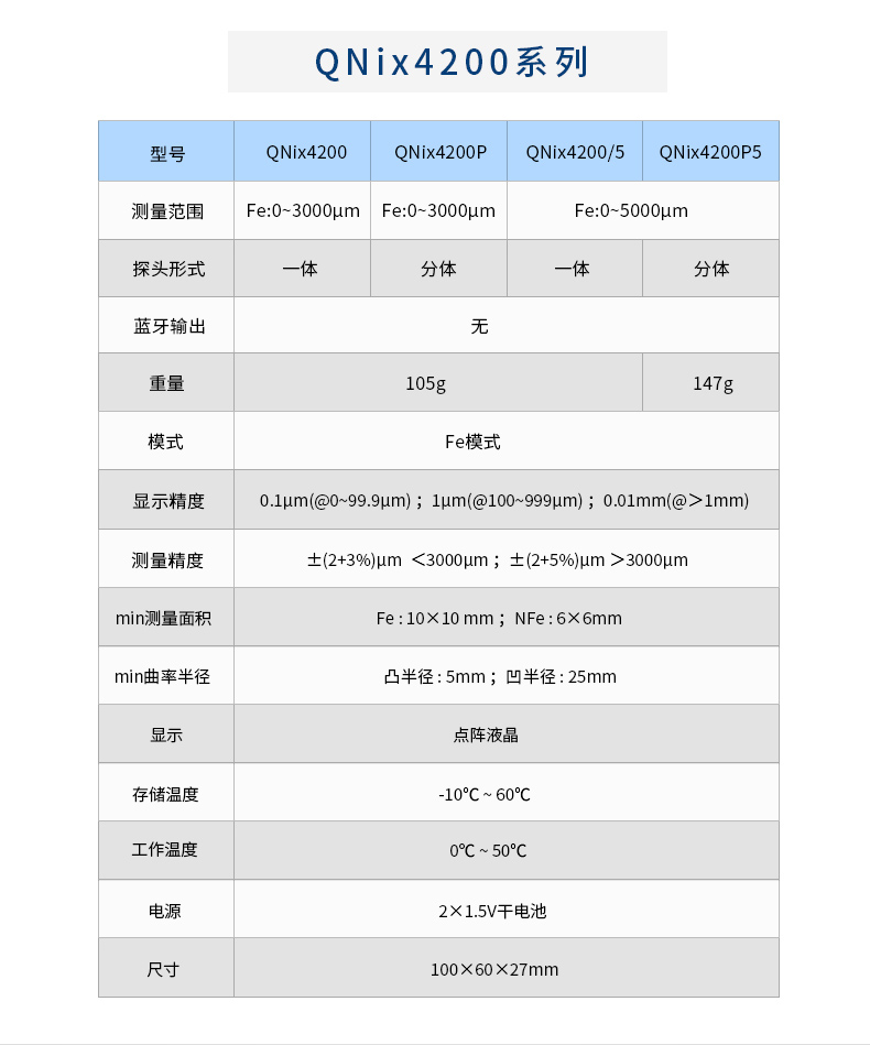 產品描述:QNix4200和QNix4500這兩種型號一體化/分體化設計,只需調零,無需校準,使用極其簡單。其中QNix4200為磁性測厚儀,可以用來測量鋼、鐵等磁性基體上的涂層、鍍層;QNix4500為磁性和渦流兩用測厚儀.........