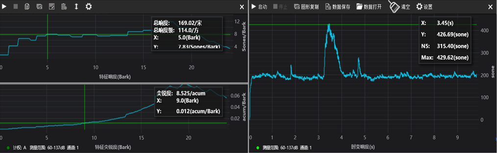 響度測量參照標準ISO 532-1(靜態響度、時變響度)、尖銳度、波動度和粗糙度測量 |